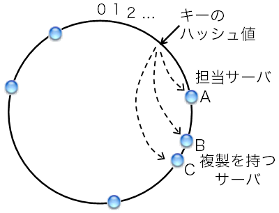 さきほどのH(キー) mod Nというハッシュ関数を使うと、 台数の増減に対してほとんどのキーに対する担当サーバが変わってしまった。 それに対して、ある種の手順で担当サーバを决めると、 台数が増減した場合でも担当サーバが変わるのは全キーの1 / N程度で済む。 すると、再配分するデータも少なくて済むし、 仮に再配分を行わなかったとしても担当の変わらなかった大多数のデータは 有効なままとなる。 このような性質を満たす担当サーバ决め手法をconsistent hashingと言う。 これはもともと、複数台でウェブのキャッシュサーバを構成する状況を想定して 考え出され、1997年に論文で発表された。 キャッシュサーバの場合、キーはウェブのURLとなる。