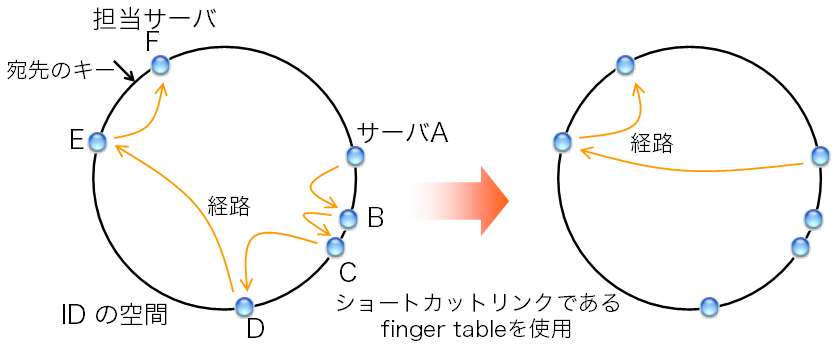 finger tableを参照することで、 先ほどの手順のようにsuccessorを一歩一歩辿るのではなく、 ひと足飛びに担当サーバに近付くことができる。 先ほどの例では、サーバAは宛先キーとfinger tableを見ることで、 ひと足とびにサーバEまで飛ばしてよいことが判る。 これによって、先ほどの手順では5回の転送が必要だったところ(図8左)、 2回の転送で担当サーバに到達できる(図8右)。 これで転送の回数がO(N)からO(log N)に減った。 1台あたりの経路表のサイズもO(log N)に抑えられている。 ID空間の大きさが2160の場合、 どんなにサーバ数が増えてもfinger tableが持つエントリ数はたかだか160である。