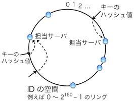 この条件を見たす手順には、例えば次のようなものがある。 0〜2160-1の整数値をとるIDの空間を考える。 これはつまり暗号学的ハッシュ関数SHA-1が返す値の範囲である。 SHA-1ではなくてMD5を使う場合は0〜2128-1とすればよい。 図2の通り、最大値2160-1の次の値は0となるようなリングを想定する。 ここで重要なのは、キーとサーバの両方に対して、 0〜2160-1の範囲からIDを割り振るという点である。 キーに対してはSHA-1の計算結果をIDとして割り振ればよい。 サーバに対しては、例えばIPアドレスのSHA-1ハッシュ値を割り振るか、 または任意の値を割り振るという方法もある。