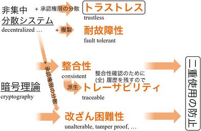 Bitcoinがそれまでと違ったのは、トラストレスに二重使用を防止したこと、と述べました。 ブロックチェーンが提供する価値は他にもあります。 図3は、ブロックチェーンが提供する価値とそれらを支える理論・技術の関係をおおざっぱに図示したものです。 例えば暗号通貨について言うと、台帳の整合性が保たれそれが改ざん困難であることで、コインの二重使用が防がれているというわけです。 こうして分析すると面白いこともわかってきます。 ブロックチェーンの価値であると広く信じられているトレーサビリティですが、暗号通貨以外の応用では必要とは限らないので、様々なソフトウェア構成があり得そうです。 詳細は割愛します。